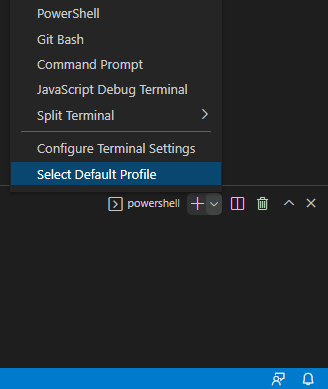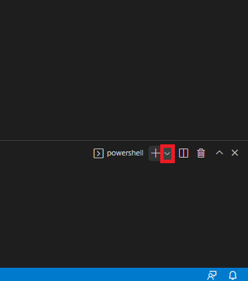 1. VS code 에서 터미널 창 우측의 ∨ 버튼을 클릭합니다 (터미널이 나오지 않을 경우 VSC 최상단 메뉴의 Terminal 에서 new Terminal 을 선택합니다.)