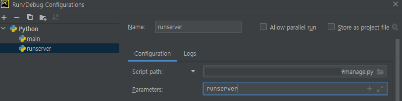 parameters 는 runserver 입력