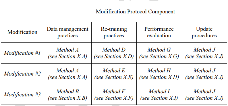 - PCCP는 구체적이고 검증 가능 해야함, modification은 Modification Protocol 내에서 성능 평가와 연계되어야 함 (Section VII.C Table1 참고)