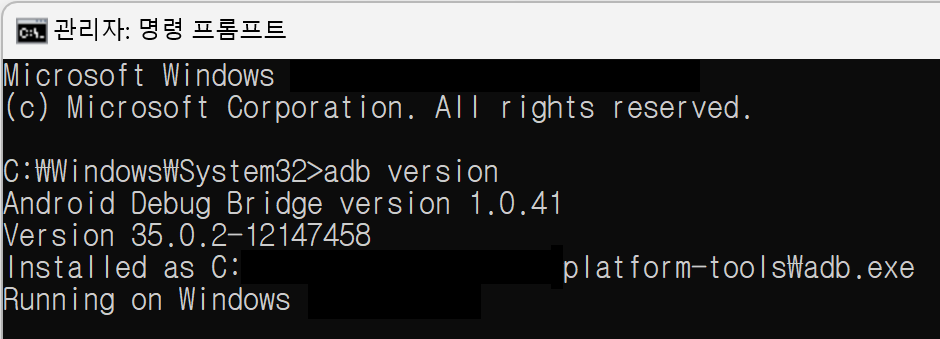 3. 관리자 권한으로 실행한 터미널에서 adb version와 같은 명령어로 adb 가 정상적 작동하는지 확인합니다.