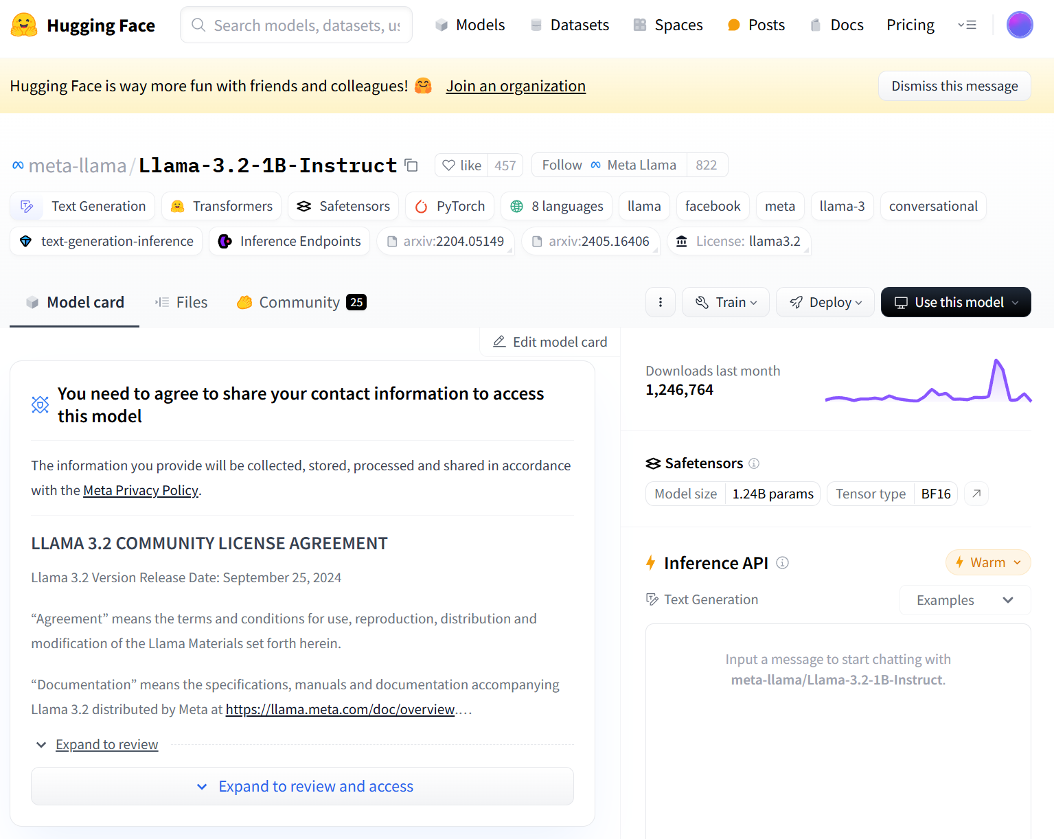 Hugging Face 에 가입하고, 사용할 Llama 3.2:1b 를 찾아봅시다.