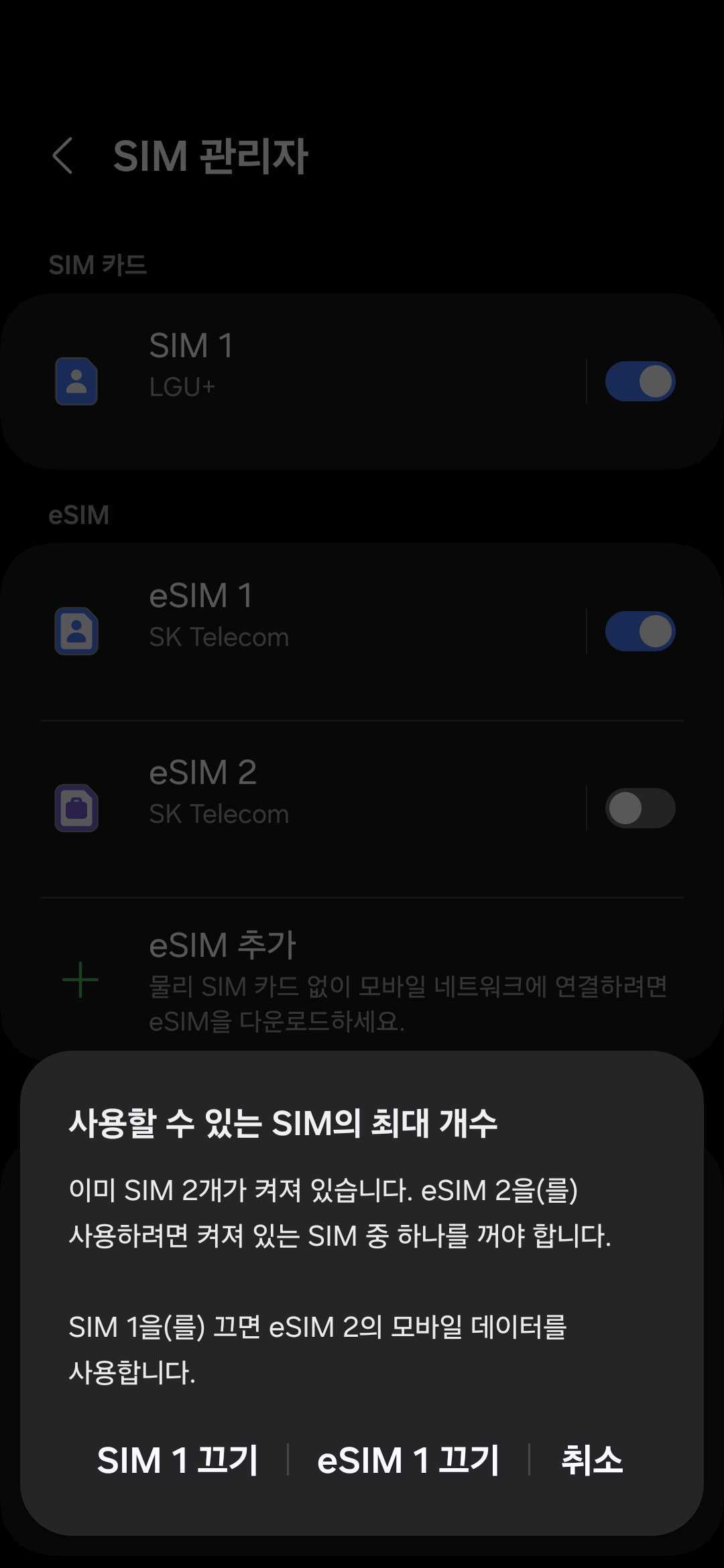 eSIM을 두 개 이상 등록하면 나타나는 화면입니다.