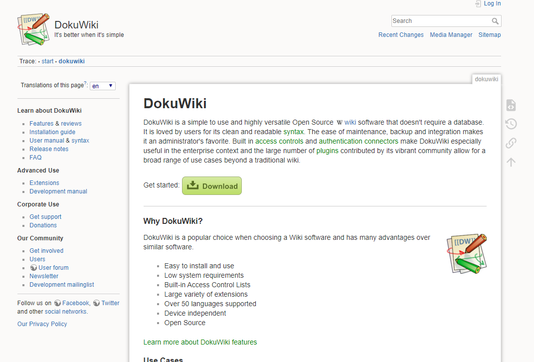 웹서버를 구축하여 업로드하면 당연히 웹 위키로서 활약할 수 있으며, 미디어 위키 못지 않게 한국어와 영어 자료가 많이 존재합니다.